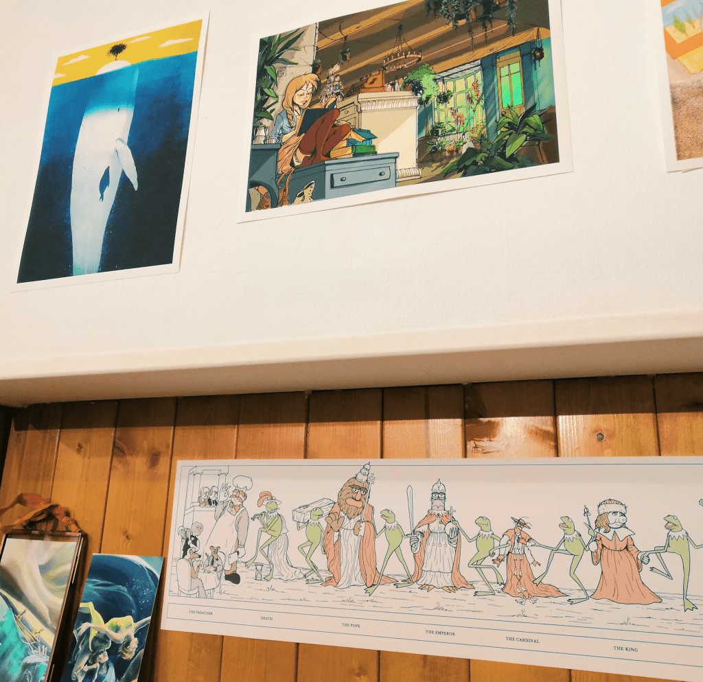 Era un ottimo momento per festeggiare! Abbiamo radunato le opere di qualche amico, le abbiamo stampate col nostro nuovo vecchio plotter ed esposte, stampato qualche t-shirt e preso qualche stuzzichino ed ecco che avevamo un’inaugurazione.