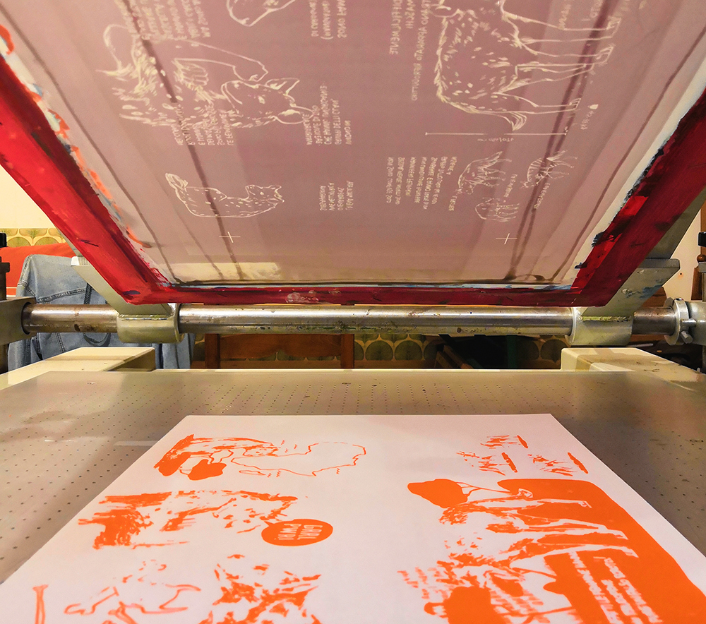 La racla – è l’aggeggio con un lato in gomma che vedete in mano ad ogni serigrafo, spinge l’inchiostro dal telaio al foglio.