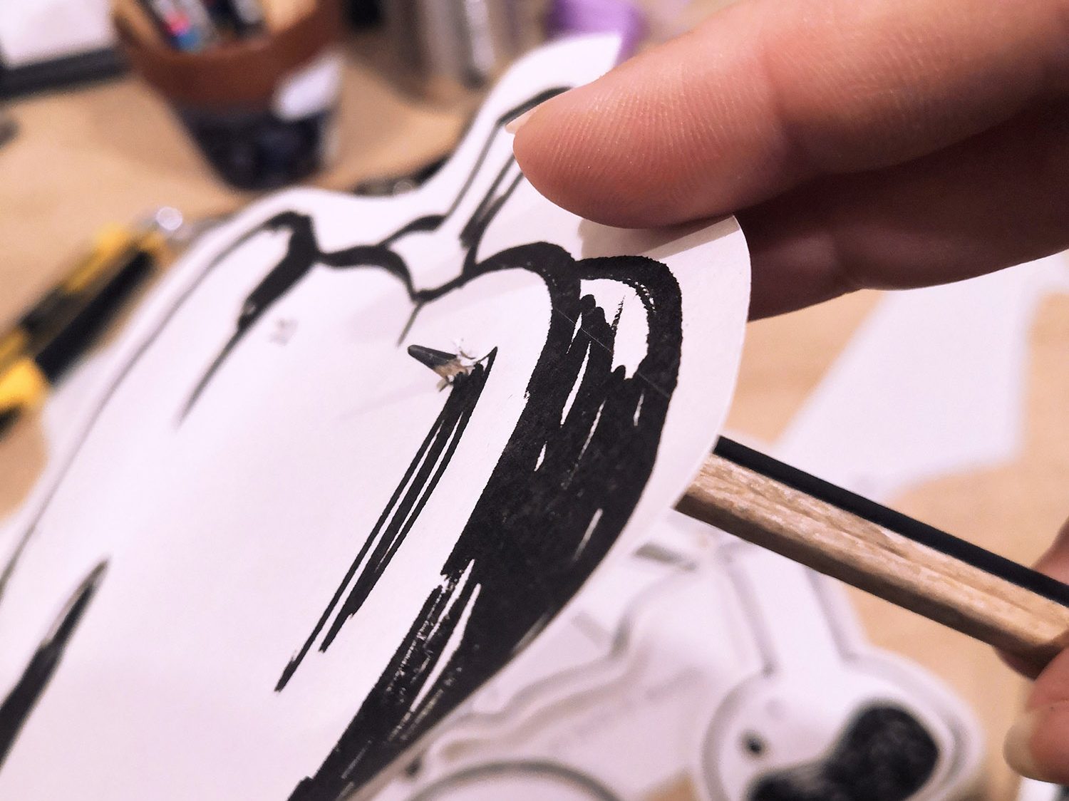 Prendete qualcosa di appuntito, una matita ben temperata funzionerà (ma anche un chiodino può andare bene), per creare i buchi in cui poi faremo passare il filo, premete la punta sulle x indicate sui fogli e fatela passare dall’altro lato bucando il foglio.