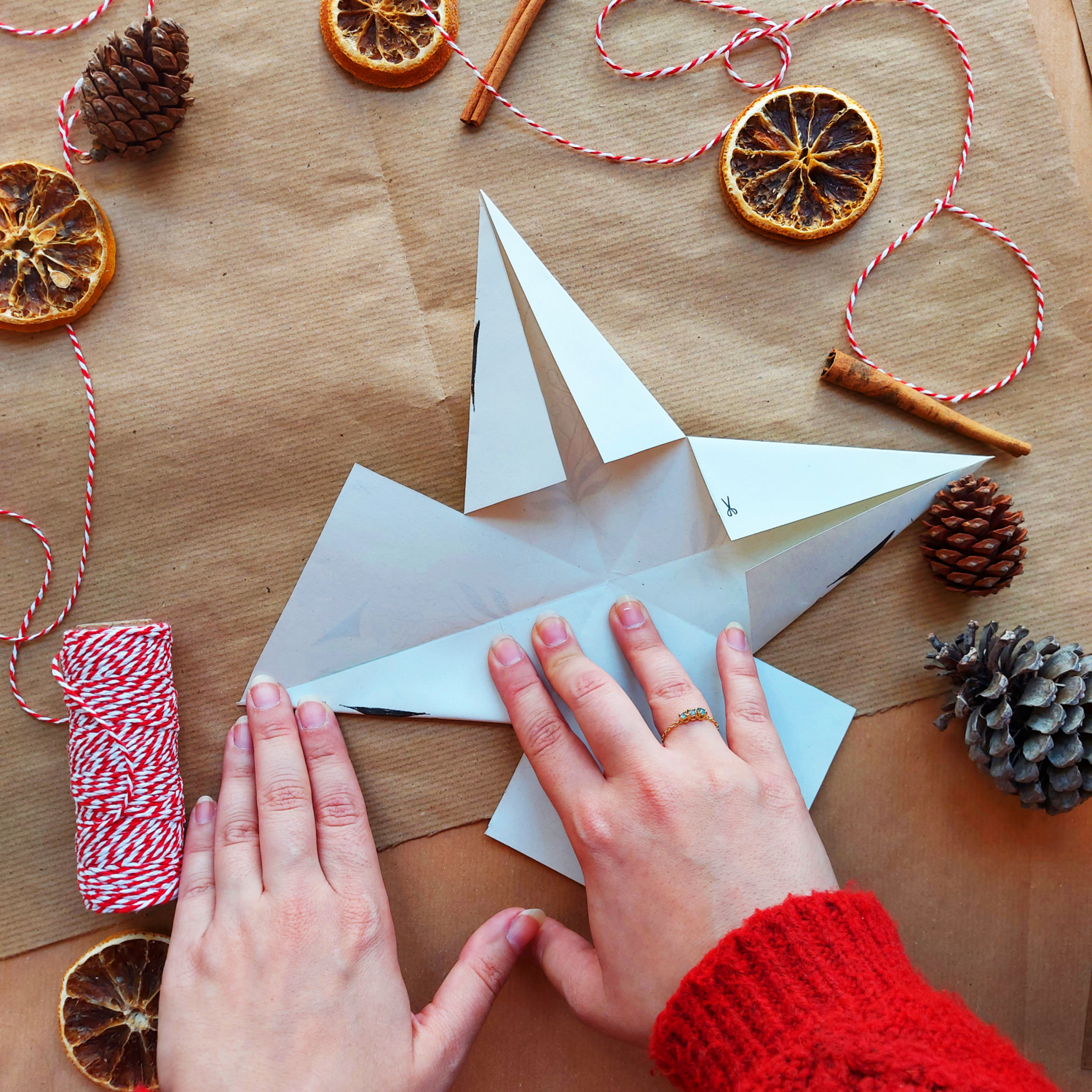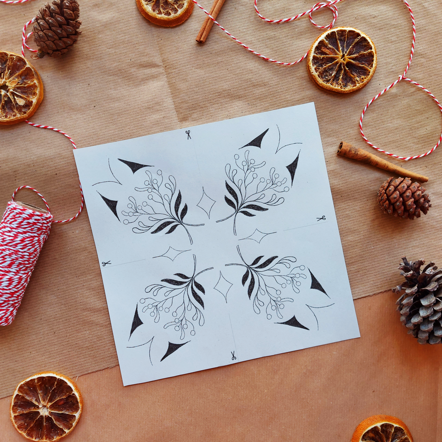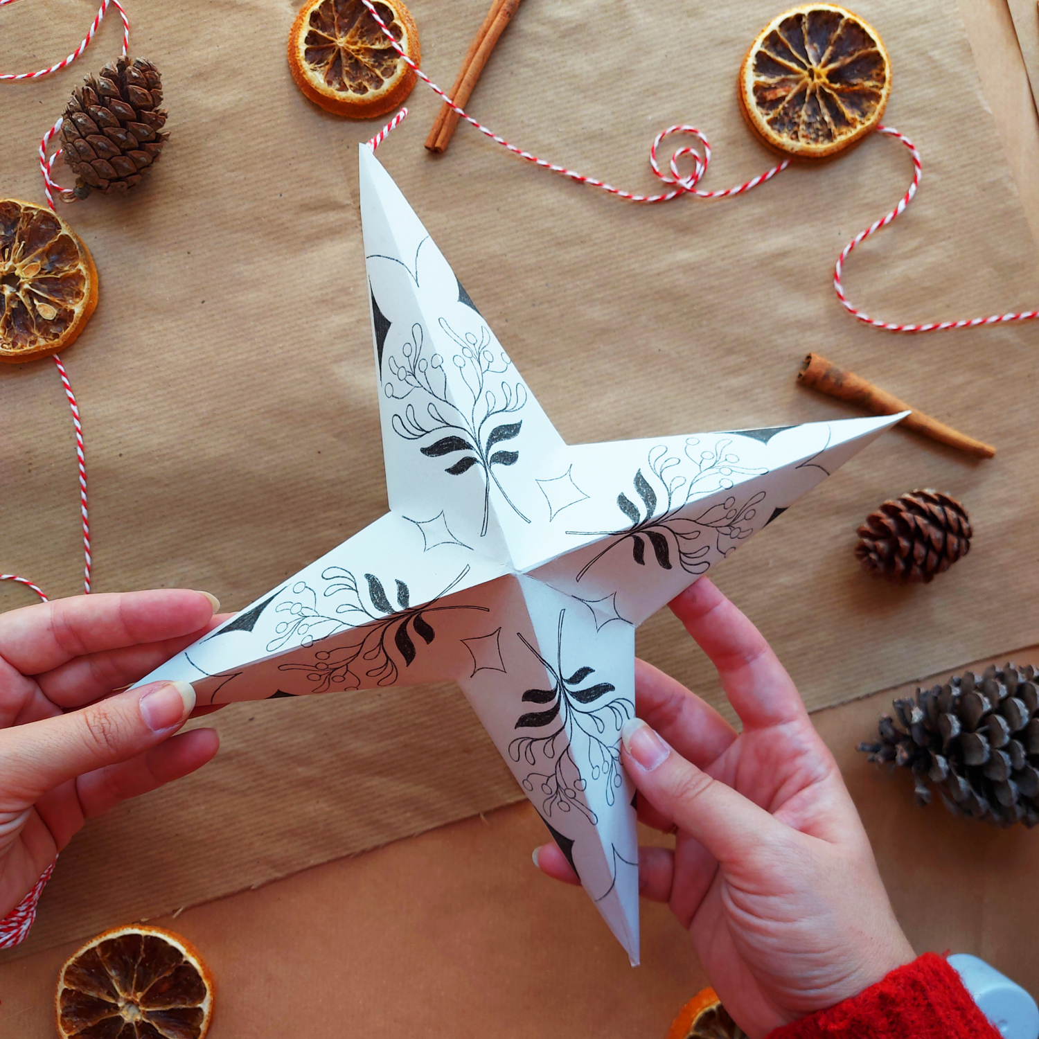 Tagliate la parte inferiore del foglio, è segnato, otterrete così un quadrato con la grafica della stella al centro.