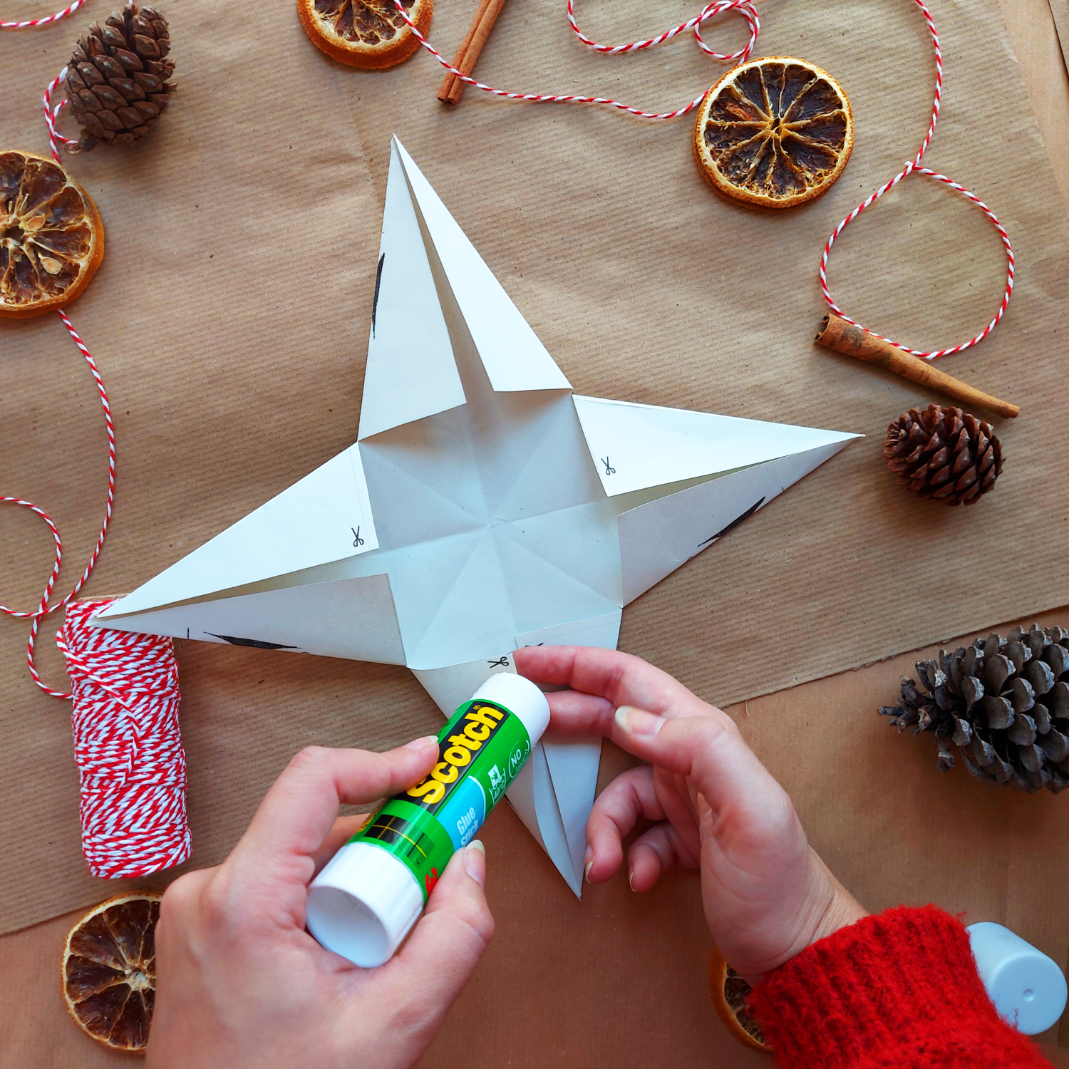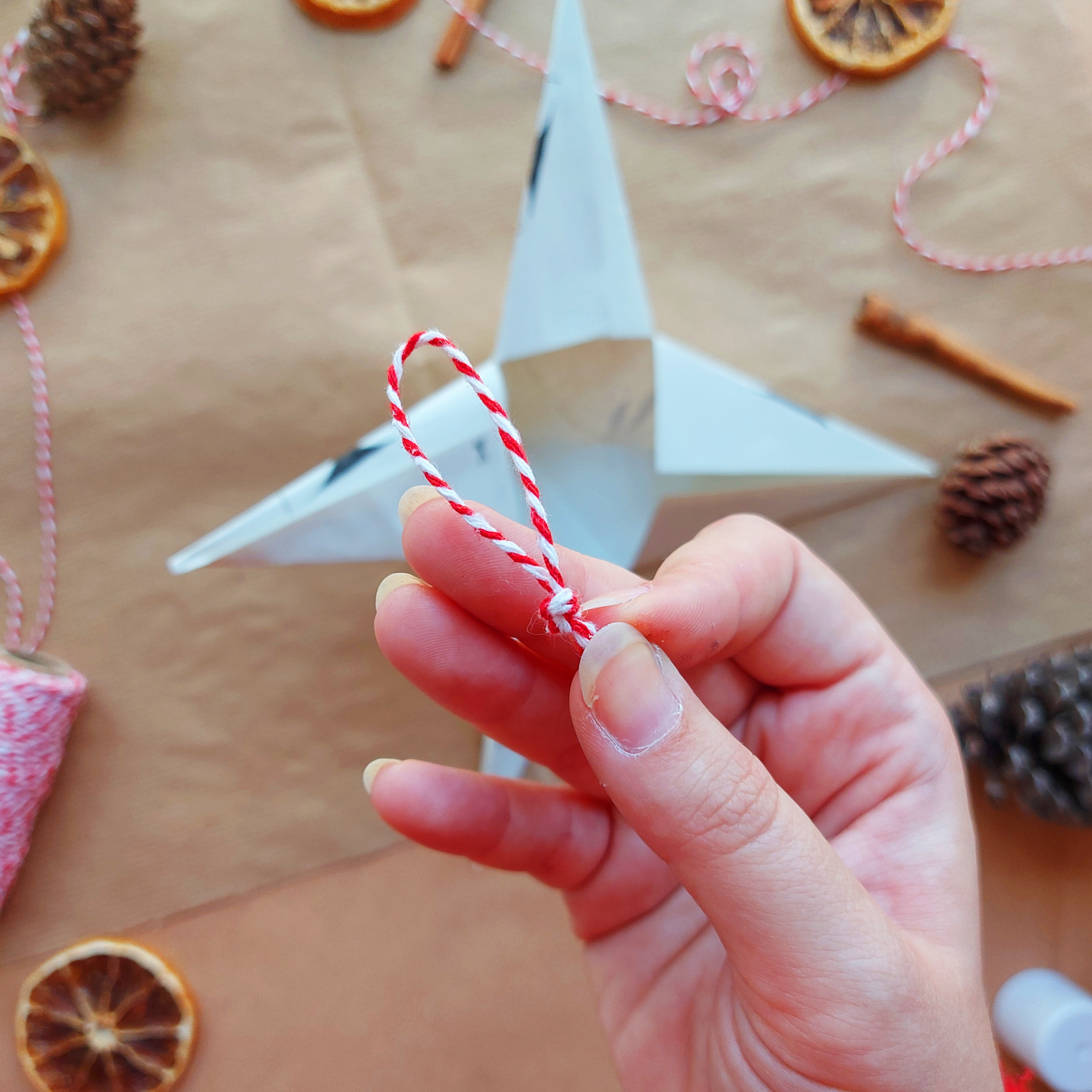 Ora, prima di incollare l’ultima punta: prendete un nastro o un filo, fate un nodino abbastanza largo, infilatelo tra i due lembi e incollate la carta come avete fatto per le altre punte. Così avrete un nastrino con cui appendere le vostre decorazioni.