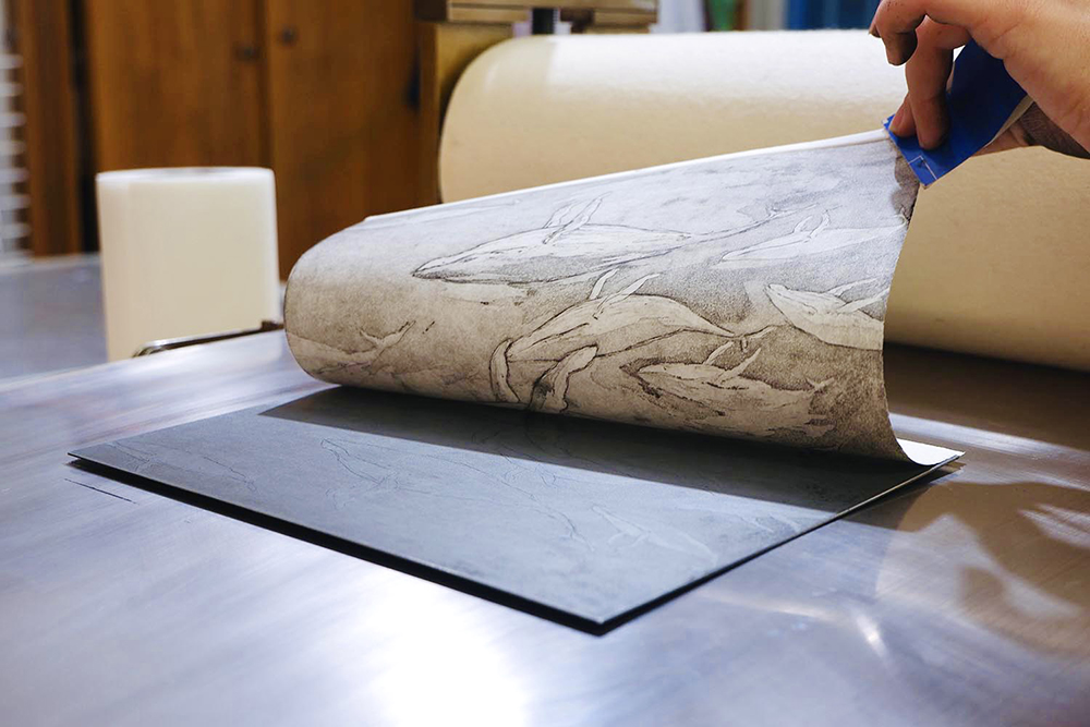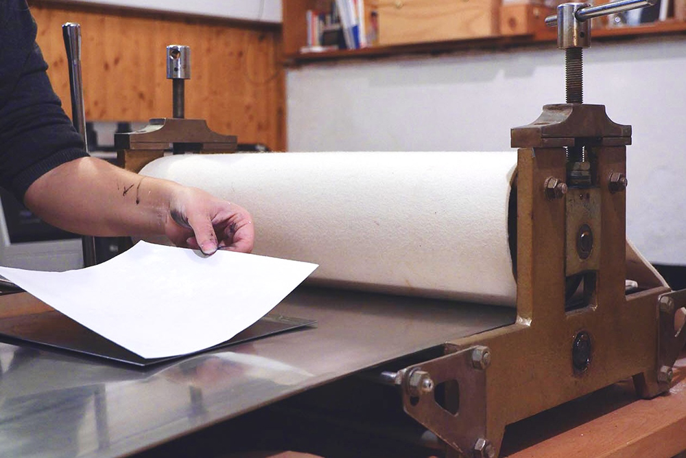 La lastra viene quindi posta sul piano del torchio , sopra di essa viene poggiato un foglio, solitamente di carta 100% cotone, precedentemente bagnato. Il tutto viene coperto dal feltro e fatto passare sotto i rulli del torchio che con la loro pressione faranno entrare la carta nei segni incisi, questa catturerà l’inchiostro e così il disegno si trasferirà dalla lastra alla carta.