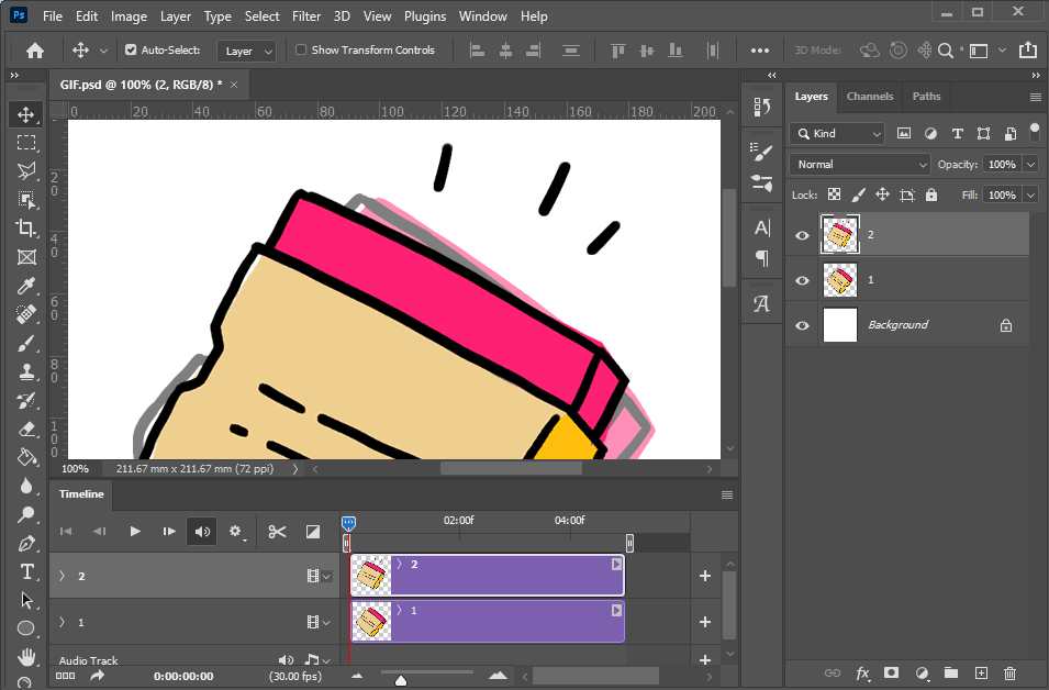 Innanzi tutto create un nuovo file e iniziate a disegnare il primo frame su un livello, quando siete sottisfattə aprite il menù a tendina Windows e selezionate “Timeline“, si aprirà una finestra, su di essa cliccate “Crea Video Timeline”. Così facendo ogni livello diventerà un frame, che potrete visualizzare appunto nella timeline. In questo modo Photoshop applicherà anche un’opacità al primo livello che vi permetterà di lavorare meglio al successivo.
