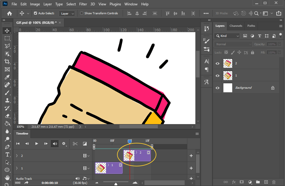 Una volta disegnati i frame regola la durata e l’ordine sulla timeline, vi basterà posizionare il mouse all’estremità sinistra o destra di un frame per modificare la durata e trascinarlo per cambiarne la posizione, cliccate il pulsante play o la barra spaziatrice per far partire l’animazione.
