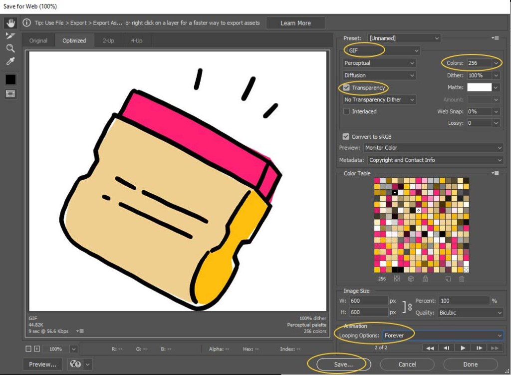 Vi si aprirà una finestra con le impostazioni per il salvataggio, nell’immagine potete vedere alcune delle impostazioni più importanti. Selezionate il formato, cioè GIF, la quantità di colori che volete utilizzare (meno ne usate meno pesante sarà il file) l’opzione trasparenza se la desiderate. Se volete che l’animazione si ripeta all’infinito selezionate “Forever” in Looping option e infine cliccate “Salva”, ed ecco fatto.
