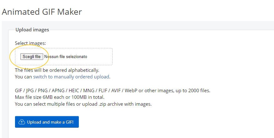 Cliccate su scegli file, caricate i vostri fotogrammi e cliccate il pulsante “Make a GIF!”