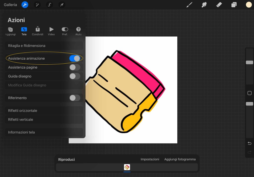 Aprite il vostro file e aprite la finestra Azioni (la chiave inglese), selezionate Tela e attivate l’assistenza animazione, così facendo livello ed ogni gruppo che creerete diventerà un fotogramma.