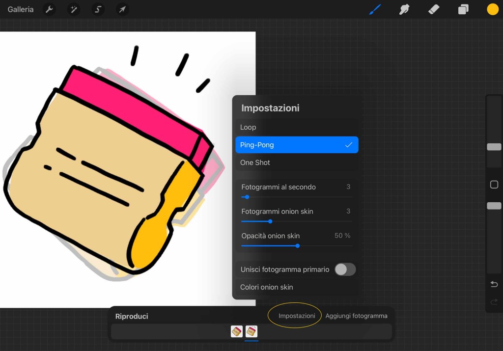Nel caso di procreate non è necessario diminuire l’opacità dei livelli, basta aprire la barra delle impostazioni impostate l’opacità onion skin, che vi permetterà di vedere i fotogrammi precedenti così da poter lavorare meglio alla vostra animazione. Impostate da qui anche la velocità a cui volete fai scorrere i fotogrammi e il tipo di loop che volete utilizzare.