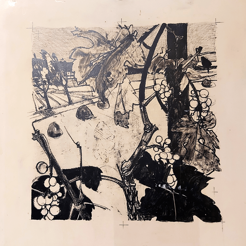 Abbiamo davanti a noi la nostra pietra granita, cioè senza nessun disegno sopra, possiamo quindi disegnarci sopra liberamente con una matita litografica. Una volta finito il disegno bisogna far fissare la parte grassa, il disegno, alla lastra. Per fare questo si utilizza una miscela di acqua, gomma arabica e acido nitrico, che viene spennellata su tutta la pietra.