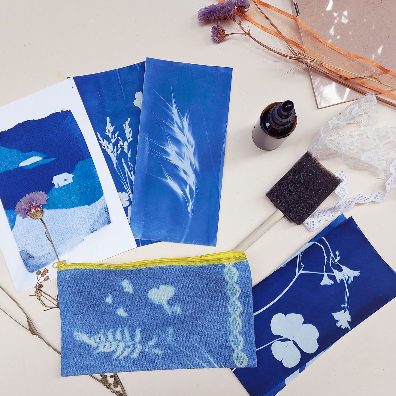 Imparerai i fondamenti dell’arte della cianotipia realizzando diverse opere, con fiori, foglie, disegni e materiali di riciclo.