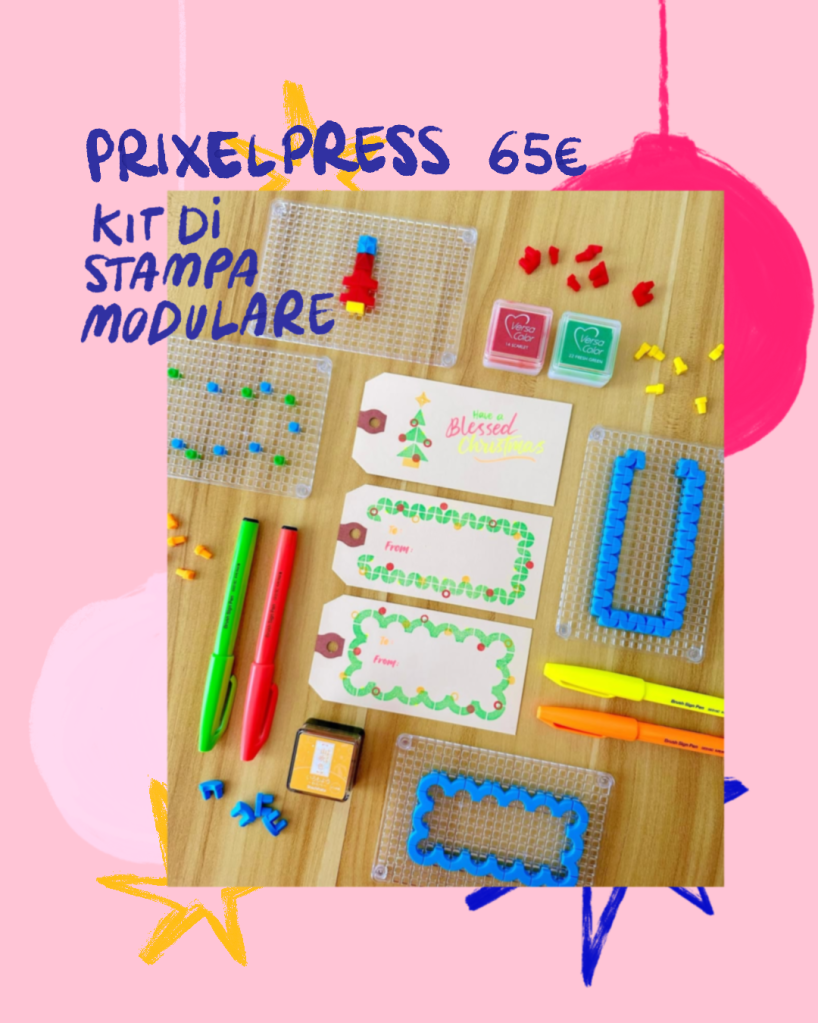 Prixel ha creato dei kit di stampa modulare con cui si possono comporre caratteri e immagini. I vari componenti si incastrano su lastre appositamente pensate, si inchiostrano con dei tappetini per timbri e siamo pronti a stampare all’infinito, riprendendo il concetto della stampa tipografica, in cui i testi si compongono pezzo per pezzo, ognuno col suo carattere. Ottimo anche da usare con i bambini.