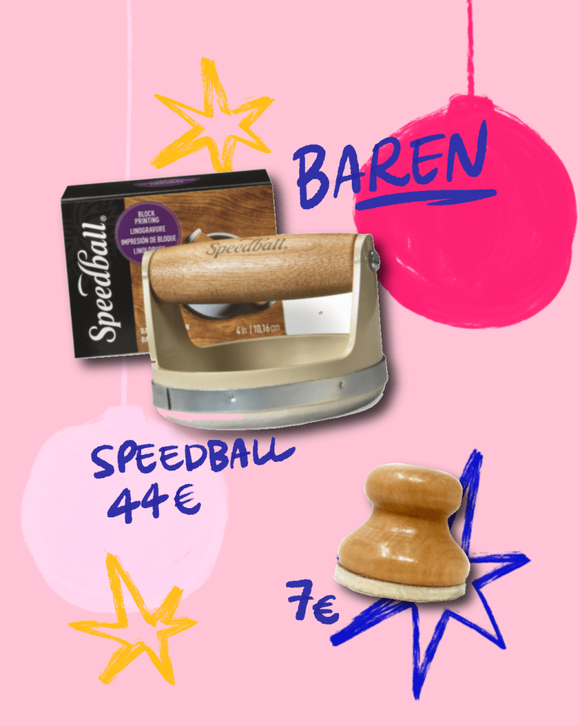 Questo strumento di origine giapponese si utilizza per stampare le incisioni a mano, senza l’utilizzo di un torchio o di una pressa, qui vi proponiamo una soluzione economica tra i sette e i dieci euro e una più professionale, da ventiquattro euro, di marca Speedball