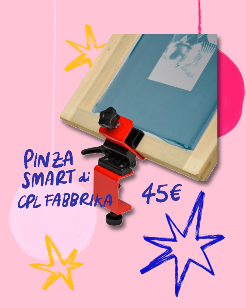 Per chi invece ama la serigrafia consigliamo la pinza smart di Cpl Fabbrika, comoda, pratica e ad un prezzo abbordabile, permette di fissare il telaio praticamente a qualsiasi tavolo e di stampare comodamente.