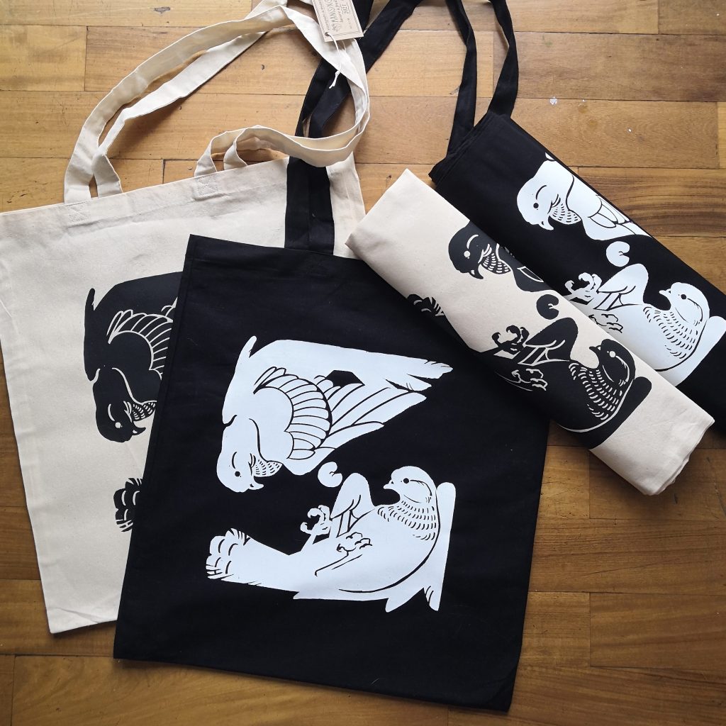 Abbiamo letteralmente disegnato e stampato due piccioni con una fava e realizzato quaderni, shopper in due colori, toppe e t-shirts. Per questi uccelli che fanno un po’ da simbolo alla città di Milano abbiamo deciso di usare uno stile molto grafico e solido per richiamare uno stile street-wear ma che ricordasse in un certo modo le creature medievali che si possono trovare nei capitelli della basilica del nostro Sant Ambroeus.